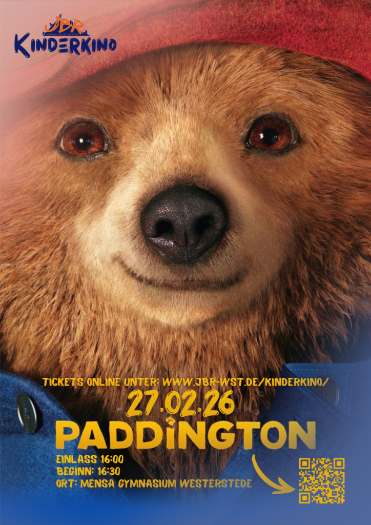 Westerstede – Der Jugendbeirat der Stadt Westerstede lädt am Freitag, den 27. Februar 2026, wieder zum beliebten Kinderkino ein. Gezeigt wird der familienfreundliche Film „Paddington“, der sich besonders an Kinder und Familien richtet. Die Veranstaltung findet in der Mensa des Gymnasiums Westerstede statt. Der Einlass beginnt um 16:00 Uhr, der Filmbeginn… Kinderkino in Westerstede: Jugendbeirat zeigt den Film „Paddington“ weiterlesen - Einladung zur Sitzung des Jugendbeirates am 05.02.2026